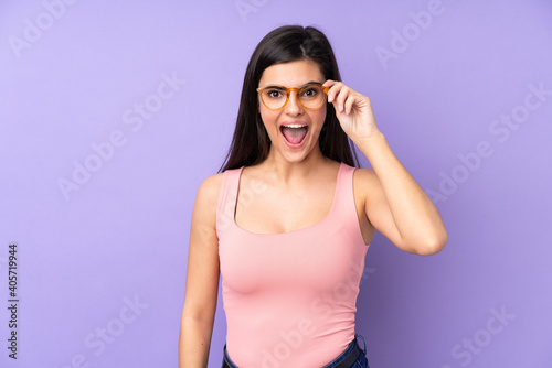 Young woman over isolated purple background with glasses and surprised