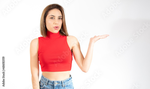 Young woman over isolated white background holding copy space imaginary on the palm to insert an ad