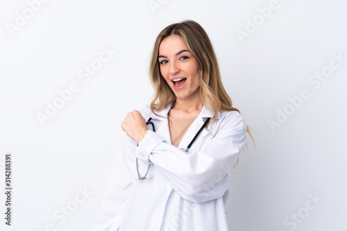 Young woman over isolated white background wearing a doctor gown and making victory gesture