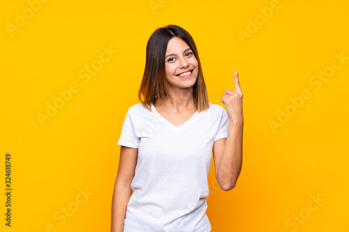 Young woman over isolated yellow background showing and lifting a finger in sign of the best