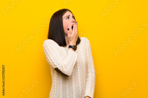 Young woman over isolated yellow wall yawning and covering wide open mouth with hand