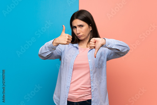 Young woman over pink and blue wall making good-bad sign. Undecided between yes or not