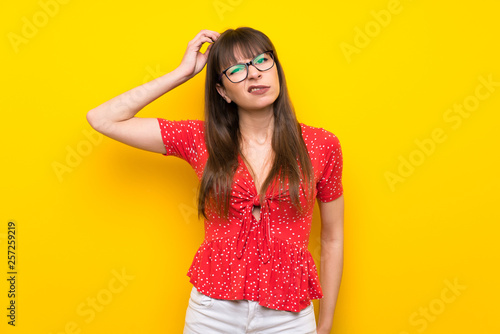 Young woman over yellow wall having doubts while scratching head