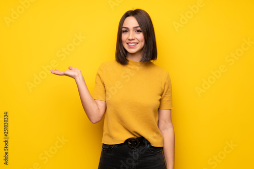 Young woman over yellow wall holding copyspace imaginary on the palm to insert an ad