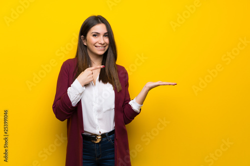Young woman over yellow wall holding copyspace imaginary on the palm to insert an ad