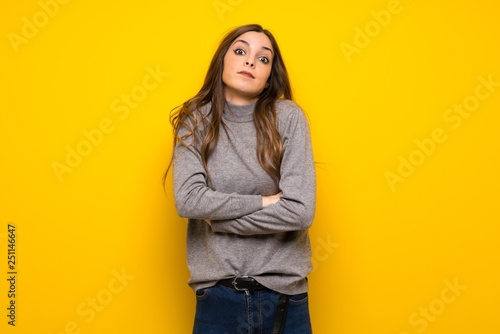 Young woman over yellow wall making doubts gesture while lifting the shoulders