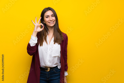 Young woman over yellow wall showing ok sign with fingers