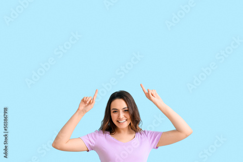 Young woman pointing at something on color background