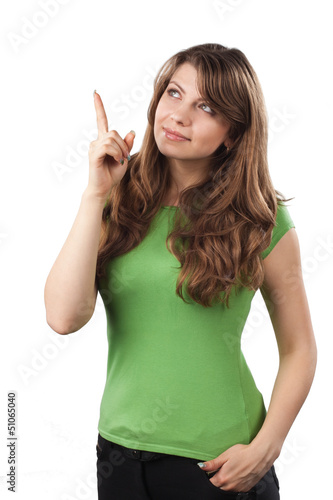 Young woman pointing up
