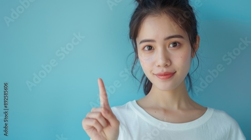 Young Woman Pointing Up with a Smile - A young woman with a bright smile points upward with her index finger, symbolizing ideas, inspiration, hope, direction, and positivity.