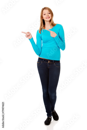 Young woman pointing with both hands