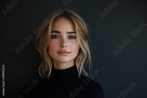 Young Woman Portrait, Golden Hair, Clear Complexion, Dark Background