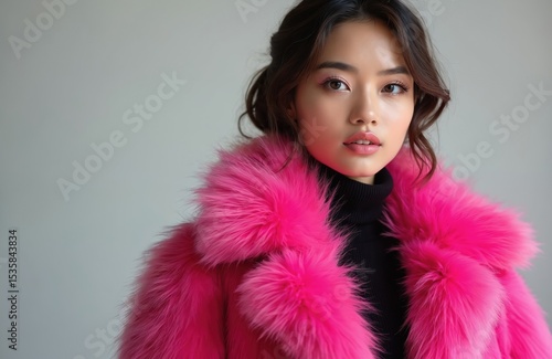 Young woman poses in vibrant pink fur coat. Portrait of attractive female in stylish outerwear. Bold fashion statement, confidence. Glamour, beauty, chic, modern outfit, winter style.