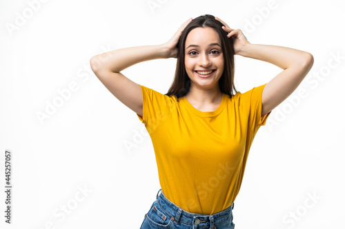 Young woman posing and smiling isolated over white background