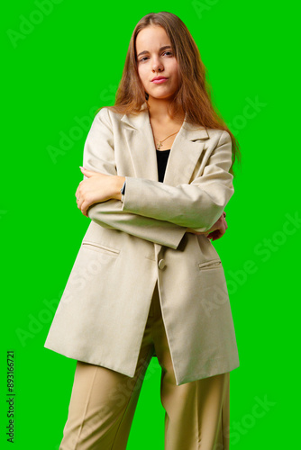 Young Woman Posing in beige Suit against green background
