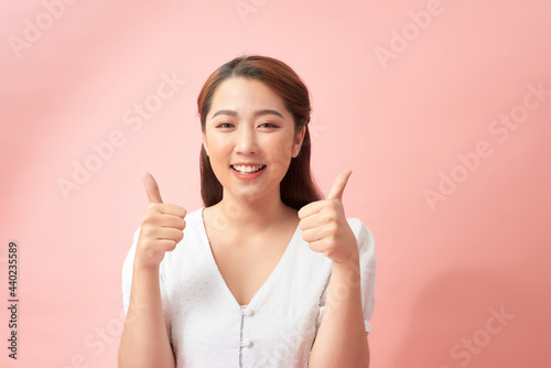 Young woman show thumb up and wearing jeans and with isolated pink background,asian