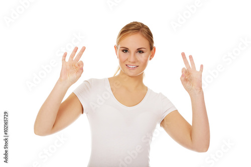 Young woman showing two OK signs