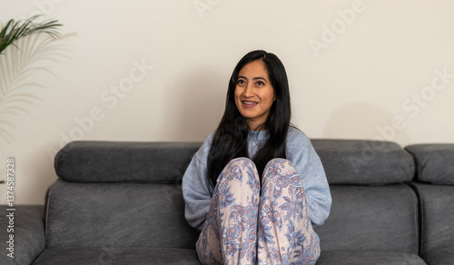 Young woman sitting comfortably on gray sofa, wearing soft pajamas, legs crossed, embodying peaceful relaxation in cozy home living room environment