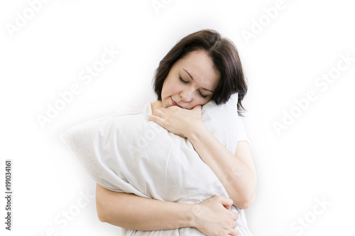 Young woman sitting on bed, hugging pillow, smiling. on white background. a girl can't Wake up