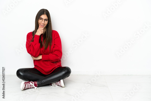 Young woman sitting on the floor isolated on white background with glasses and smiling