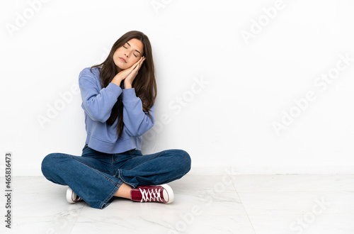 Young woman sitting on the floor making sleep gesture in dorable expression