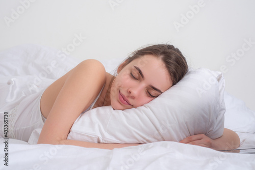 Young woman sleeping well in bed hugging soft white pillow. Girl resting, good night sleep. Woman sleeping. Beautiful young woman lying in bed and keeping eyes closed while covered with blanket.