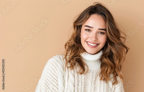 Young Woman Smiles Joyfully in Cozy Sweater Against Neutral Background