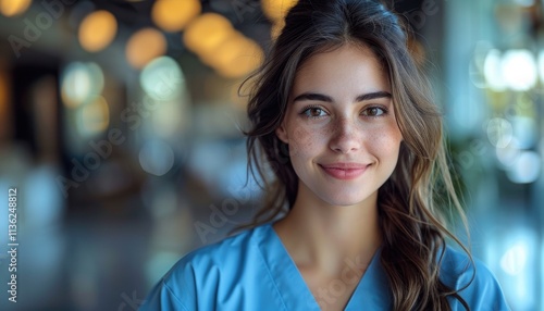 Young Woman Smiles Wearing A Blue Medical Scrub Top