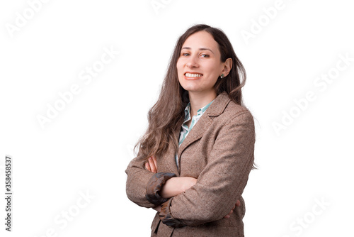 Young woman smiling at the camera with arms crosse over white background