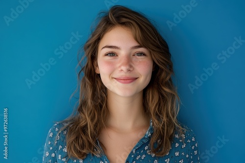 Young Woman Smiling in Floral Shirt, Blue Background. Generative AI.