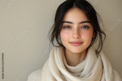 Young woman smiling warmly while wearing a cozy scarf against a neutral background
