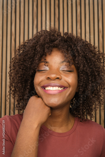 Young woman smiling with closed eyes and hand on chin