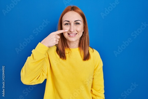 Young woman standing over blue background pointing with hand finger to face and nose, smiling cheerful. beauty concept