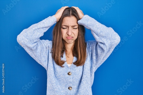 Young woman standing over blue background suffering from headache desperate and stressed because pain and migraine. hands on head.