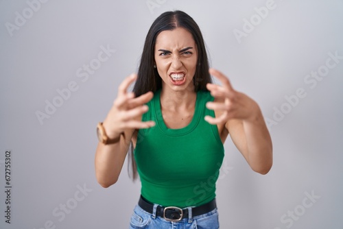 Young woman standing over isolated background shouting frustrated with rage, hands trying to strangle, yelling mad