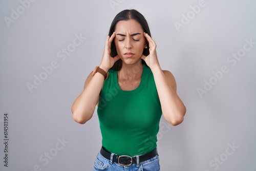 Young woman standing over isolated background with hand on head, headache because stress. suffering migraine.