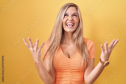 Young woman standing over yellow background celebrating mad and crazy for success with arms raised and closed eyes screaming excited. winner concept