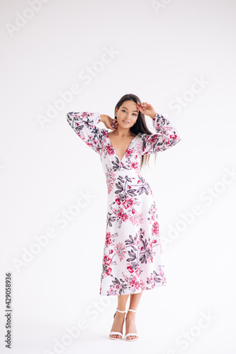 Young woman stands dressed in floral pattern dress on white background.