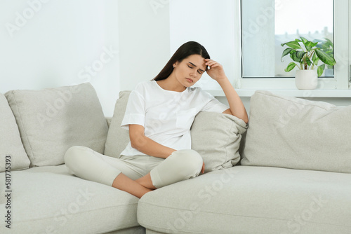 Young woman suffering from headache on sofa at home. Hormonal disorders