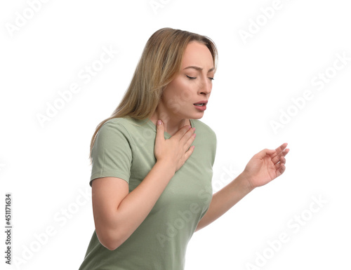 Young woman suffering from pain during breathing on white background