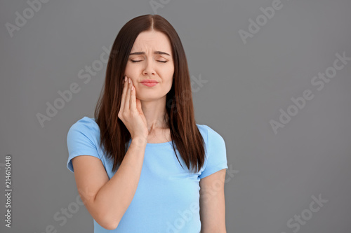 Young woman suffering from toothache on grey background