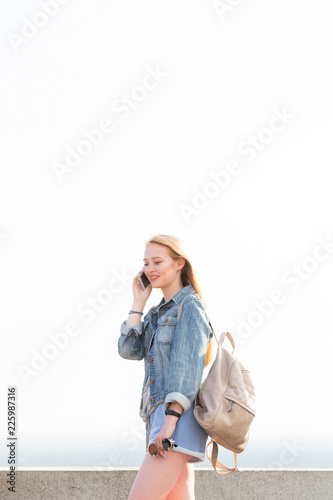 Young woman talking on mobile phone while working with laptop at desk. Home office