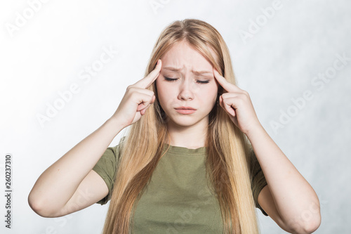 Young woman thinking, fingers on temples, trying to remember something, on the gray background.