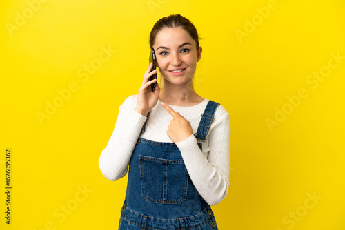 Young woman using mobile phone over isolated yellow background pointing to the side to present a product