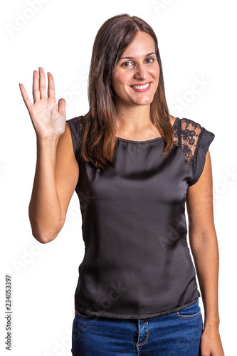 young woman waving with a hand isolated on a white background