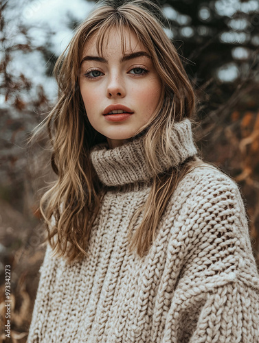 Young woman wearing a cozy sweater poses outdoors in a natural setting during autumn