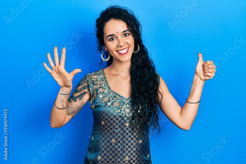 Young woman wearing bindi and traditional kurta dress showing and pointing up with fingers number six while smiling confident and happy.