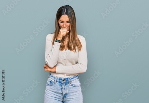Young woman wearing casual clothes feeling unwell and coughing as symptom for cold or bronchitis. health care concept.