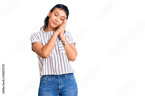 Young woman wearing casual clothes sleeping tired dreaming and posing with hands together while smiling with closed eyes.