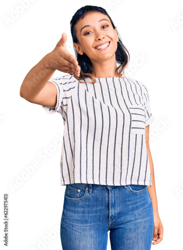 Young woman wearing casual clothes smiling friendly offering handshake as greeting and welcoming. successful business.